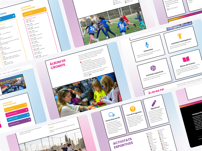 El disseny de la marca parteix d’un enfocament amable i proper, amb formes orgàniques i colors vius que evoquen dinamisme i accessibilitat. Cada element gràfic ha estat pensat per connectar amb un públic familiar i intergeneracional, i per reforçar el missatge que tothom hi té un lloc, independentment de l’edat, el nivell o la motivació.